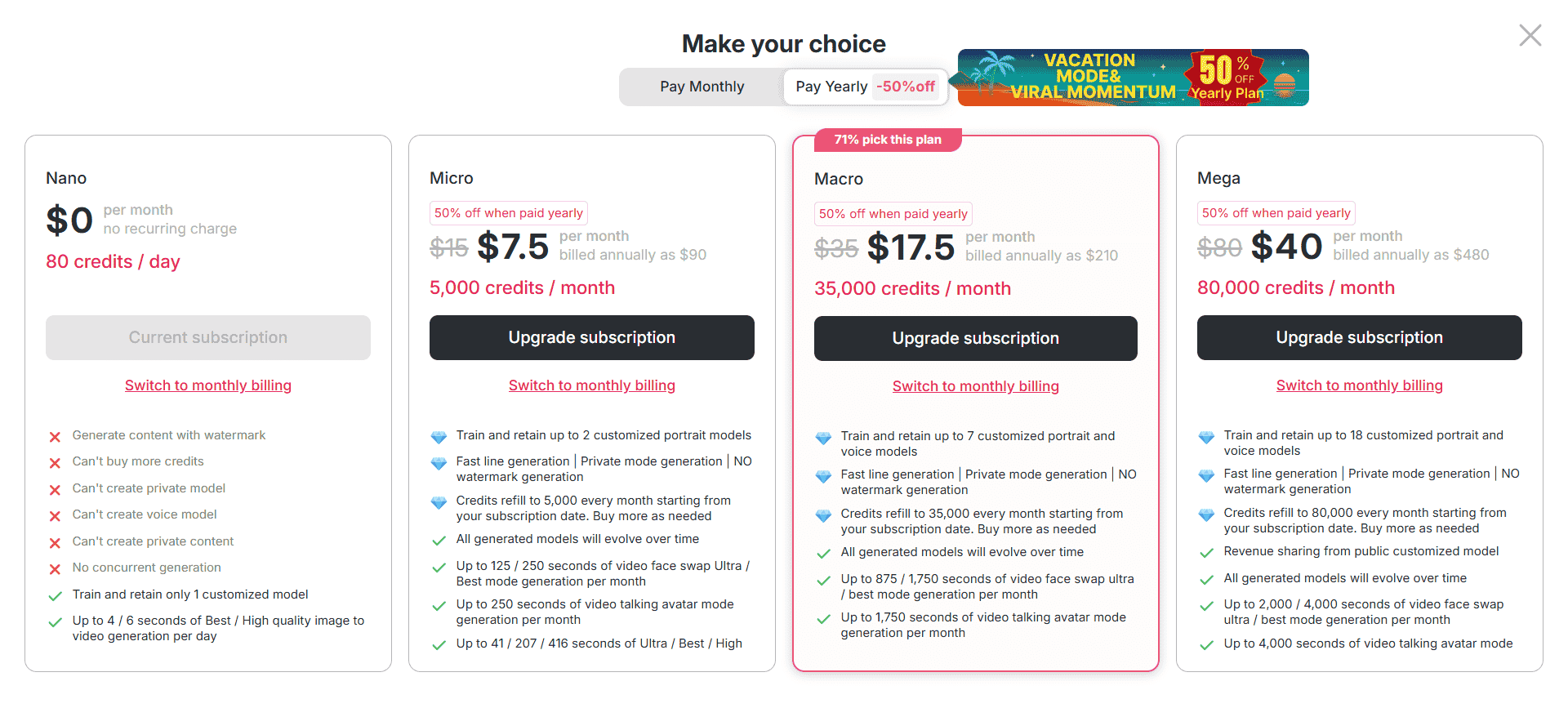 - Up to 875–1,750 seconds of video face swap Ultra/Best per month.